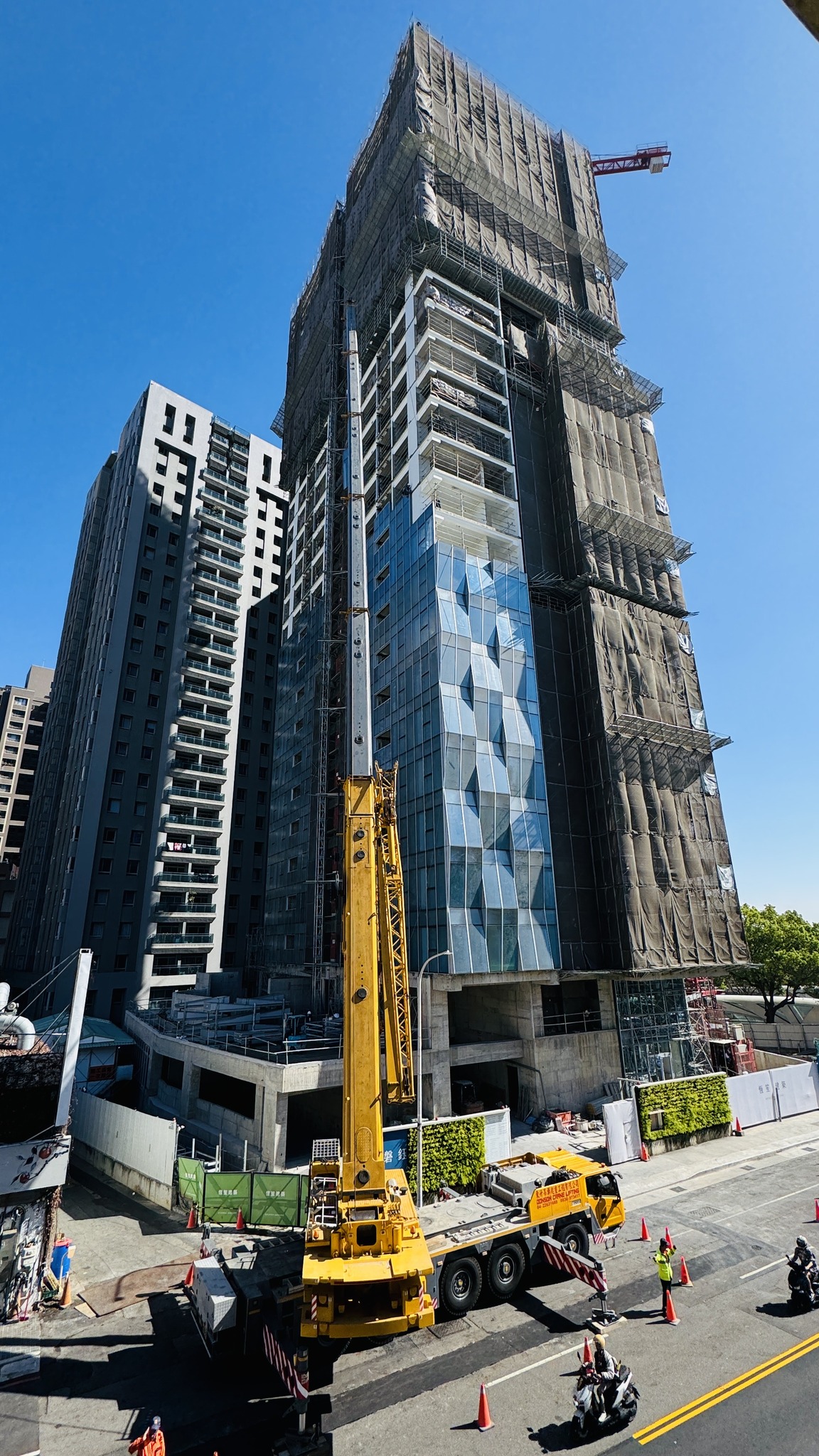 目前,我們正全力推進單元式帷幕工程的吊裝。整體施工流程環環相扣,每一道工序皆為關鍵節點,直接影響工程進度控管與品質穩定度。因此,嚴格的把關各項細節至關重要,從原材料檢驗、加工製程到最終安裝定位,全面落實品質標準與施工精度,確保工程安全都需符合最高標準。