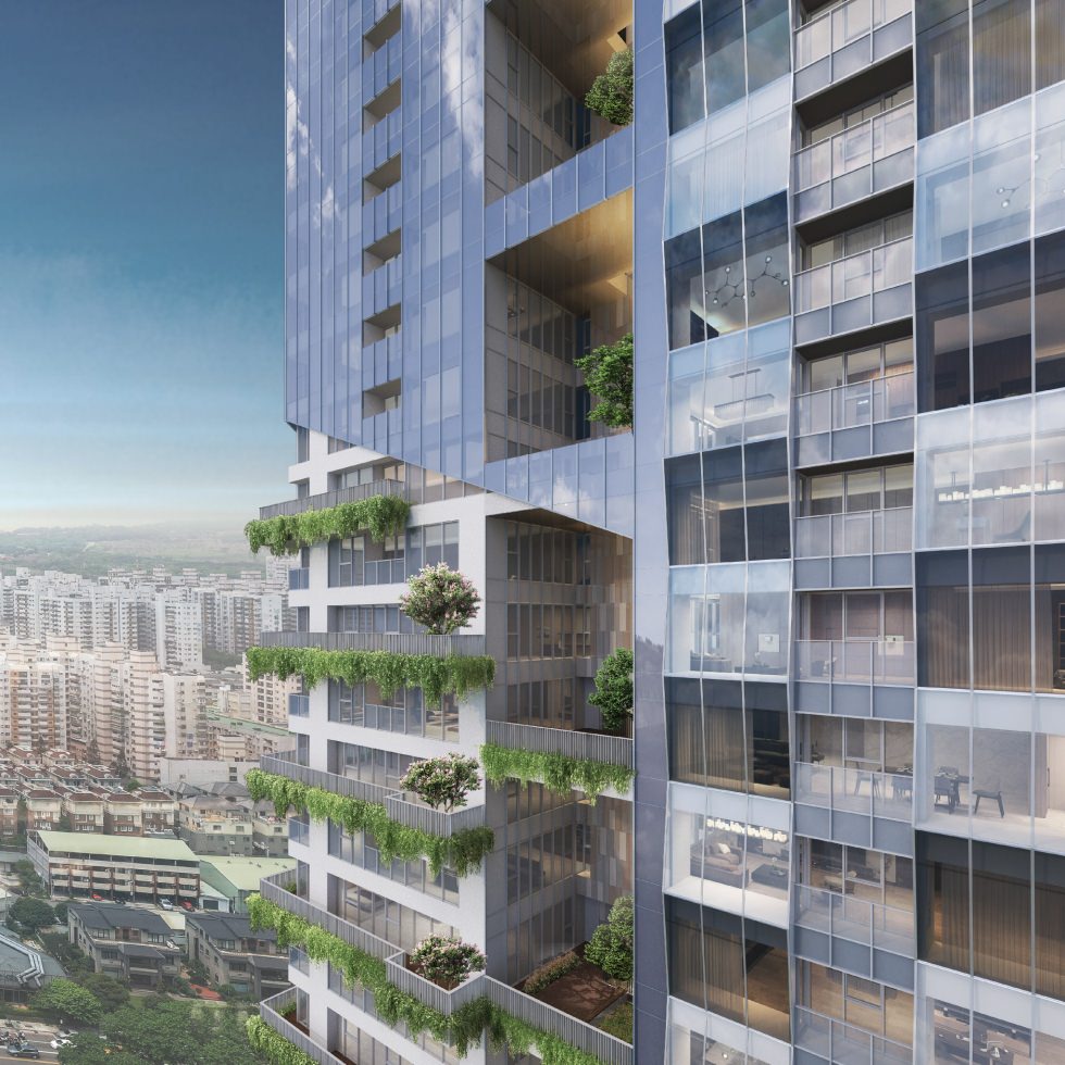 台中市西屯區|國際團隊以數位建築與低碳美學,在城市裡植下一座革命性的建築。建築7°斜角帷幕玻璃呈現寶石切面外觀,四面採光引入光影變化,兼具節能與美感。外觀綠意映照東海校區,植栽如綠色流瀑,象徵與自然共生的初心。60%高綠覆開放空間,92戶住家、1戶店面,每戶面面採光,每3層設空中花園,含8戶私家綠院,形塑如空中三合院的共享自然場域,串連社區情感,讓生活更貼近四季自然。