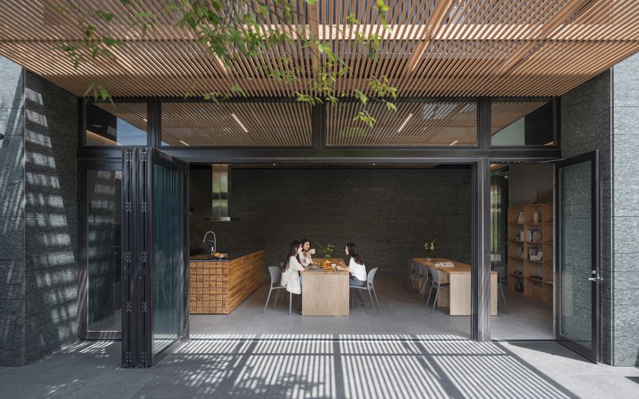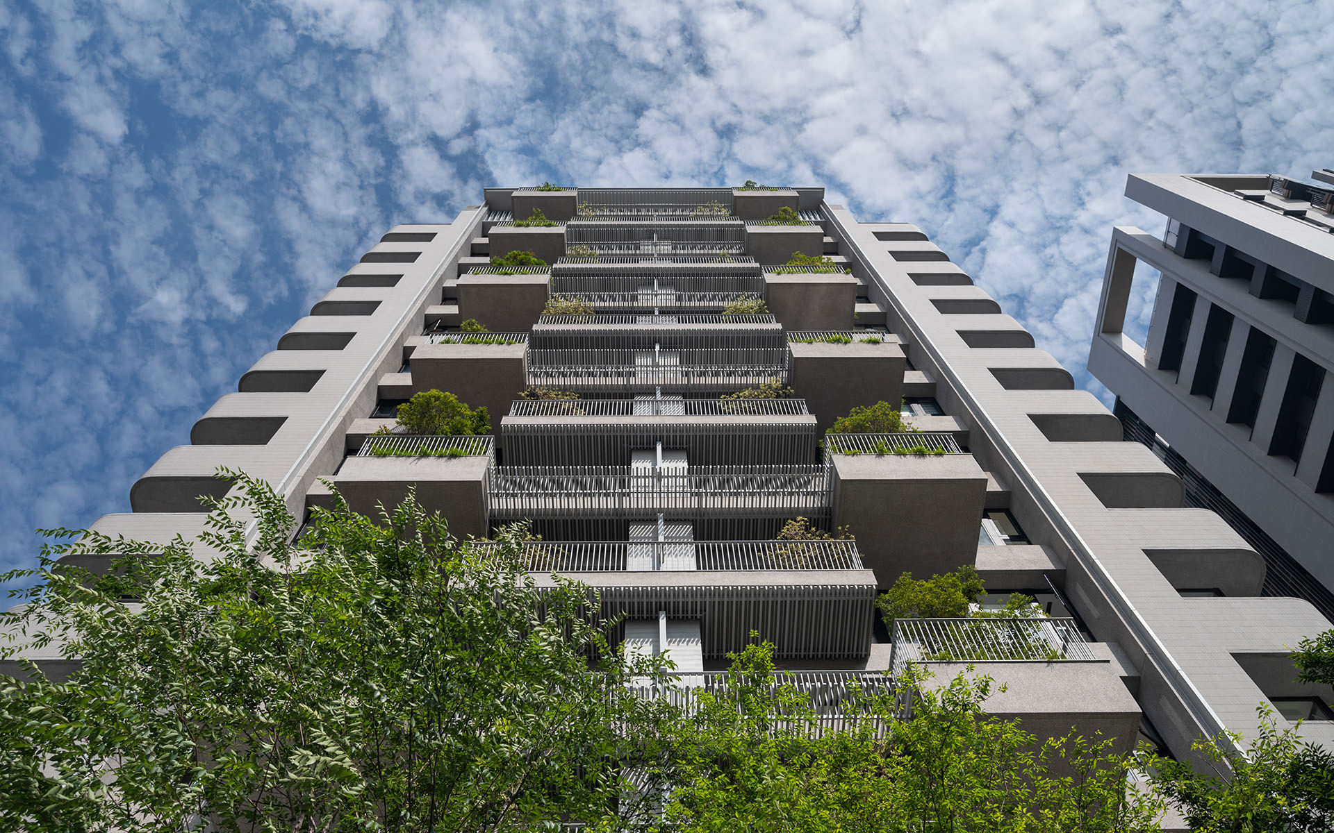 台中市南區|一座懷抱生活理想的質感家宅,從餐桌到家人,從食堂到建築,每一張桌子都是盛載生活的容器。總戶數47戶住家、2戶店面,建築立面採現代簡約風格,屋突量體與立面呼應,透過矩形設計與結構整合,形塑穩定厚實的外觀。兩側以銀色垂直格柵營造垂直呼吸感,南向則以金屬擴張網結合屋脊裝飾,展現整體量體構成。設計回應不同人生階段的居住需求,從都市尺度回歸土地與空間的環境美學。